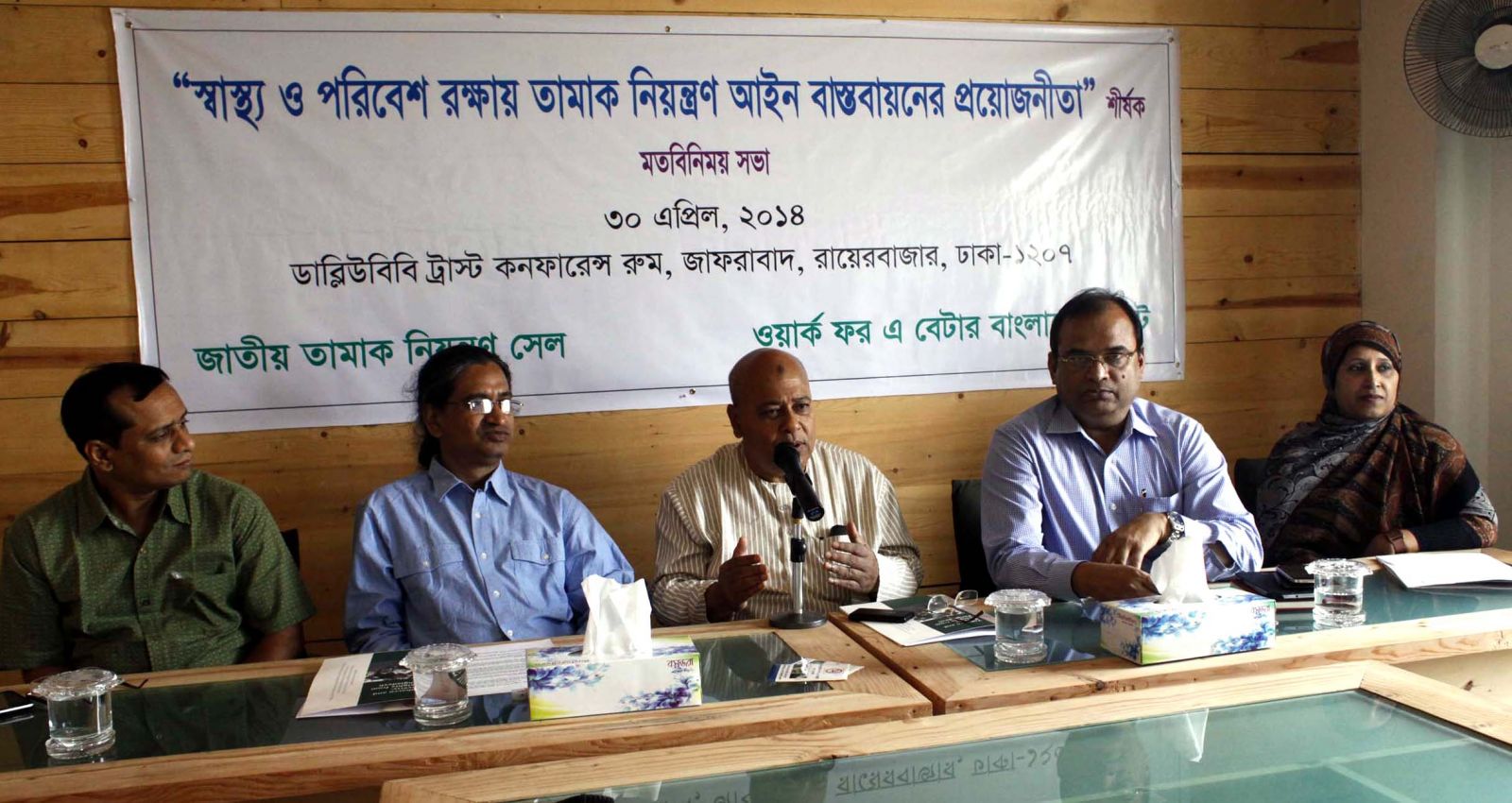 ৩০ এপ্রিল সকালে ডাব্লিউবিবি ট্রাস্ট কনফারেন্স কক্ষে (জাফরাবাদ, রায়েরবাজার) স্বাস্থ্য ও পরিবার কল্যাণ মন্ত্রণালয়ের আওতাধীন জাতীয় তামাক নিয়ন্ত্রণ সেল (এনটিসিসি) এবং ওয়ার্ক ফর এ বেটার বাংলাদেশ ট্রাস্ট 'স্বাস্থ্য ও পরিবেশ রক্ষায় তামাক নিয়ন্ত্রণ আইন বাস্তবায়নের প্রয়োজনীয়তা' শীর্ষক মতবিনিময় সভার আয়োজন করে।
