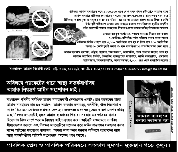 অবিলম্বে প্যাকেটের গায়ে স্বাস্থ্য সতর্কবানীসহ তামাক নিয়ন্ত্রণ আইন সংশোধন চাই