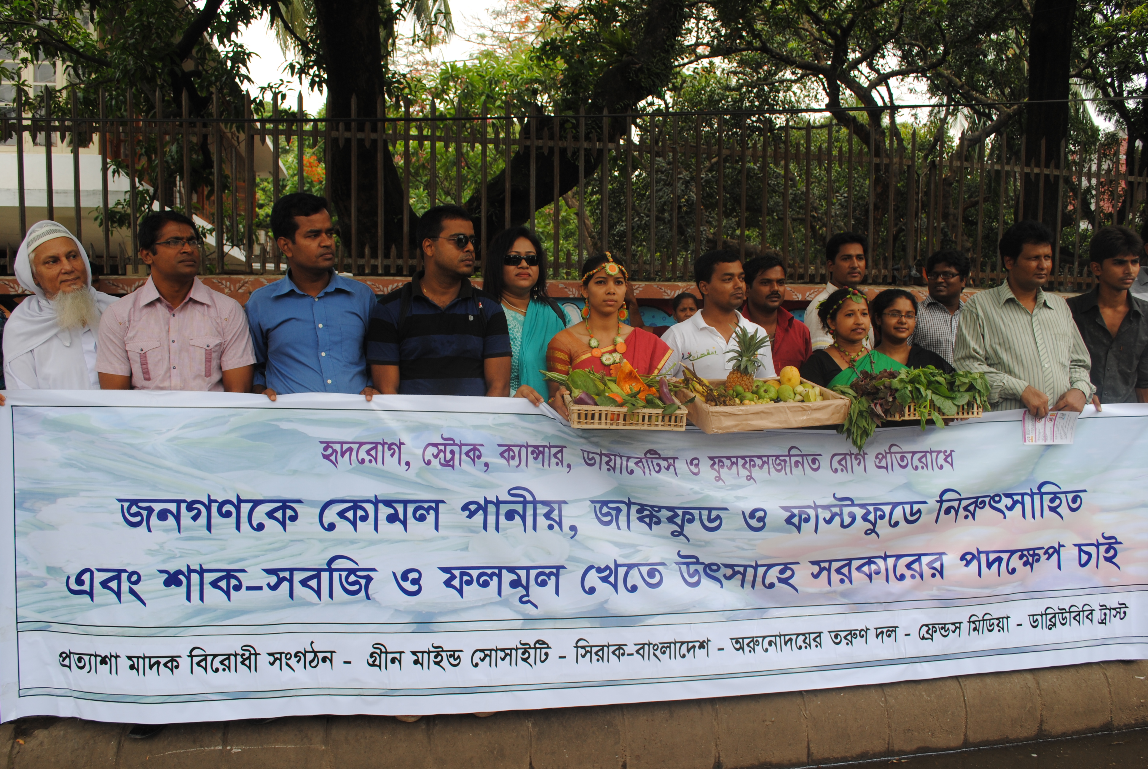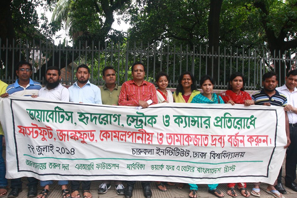 ক্যান্সার, ডায়বেটিস, হৃদরোগ, উচ্চরক্তচাপসহ অসংক্রামক রোগ নিয়ন্ত্রণ করতে ফাস্টফুড ও জাঙ্কফুড, কোমল পানীয়-এনার্জি ড্রিংক্স-প্যাকেটজাত জুস এর মত ক্ষতিকর পণ্যের উপর উচ্চহারে কর আরোপ এবং এসব ক্ষতিকর পণ্যের বিজ্ঞাপন বন্ধ করার জন্য দাবি জানিয়েছে কয়েকটি বেসরকারি সংগঠন। ১৯ জুন, ২০১২ সকাল ১১ টায় ঢাকা বিশ্ববিদ্যালয়ের চারুকলা ইন্সটিটিউটের সামনে ডাব্লিউবিবি ট্রাস্ট, প্রত্যাশা মাদকবিরোধী সংগঠণ, গ্রীন মাইন্ড সোসাইটি, সিরাক বাংলাদেশ ও অরুনোদয়ের তরুন দল এর উদ্যোগে অবস্থান কর্মসূচীর মাধ্যমে এই দাবী জানানো হয়। ...