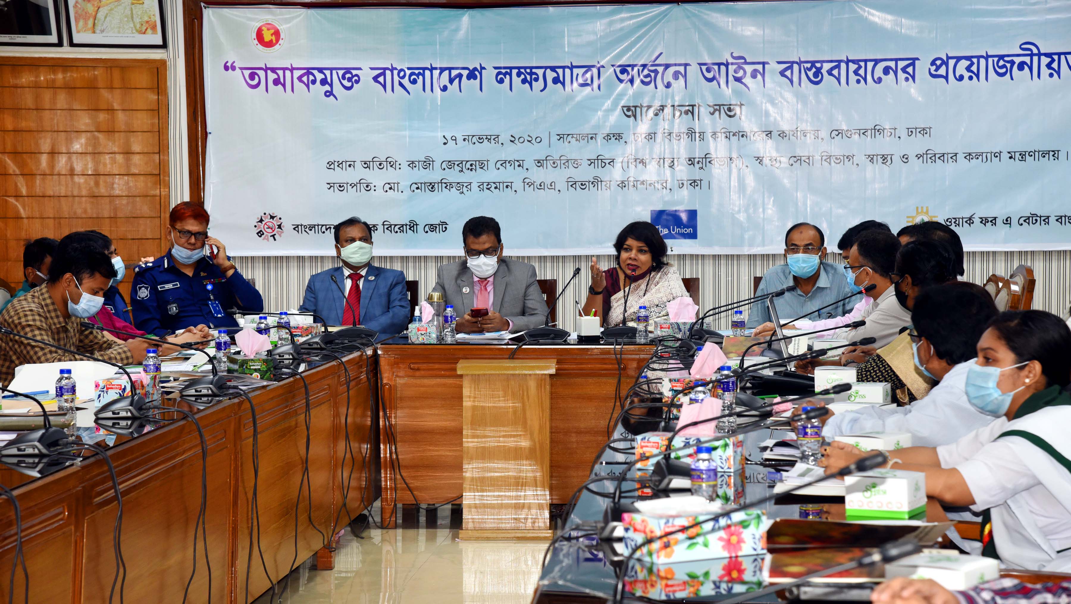১৭ নভেম্বর, ২০২০ ঢাকা বিভাগীয় কমিশনারের কার্যালয়ে স্বাস্থ্য ও পরিবার কল্যাণ মন্ত্রণালয়ের অতিরিক্ত সচিব কাজী জেবুন্নেছা বেগম বলেন, মাননীয় প্রধানমন্ত্রী ২০৪০ সালের মধ্যে বাংলাদেশকে তামাকমুক্ত করার যে ঘোষণা দিয়েছেন তা বাস্তবায়নে সকলের সহযোগিতায় একটি রোডম্যাপ প্রণয়ন করা হচ্ছে। বিভাগীয় কমিশনারের কার্যালয়-ঢাকা, বাংলাদেশ তামাক বিরোধী জোট, ওয়ার্ক ফর এ বেটার বাংলাদেশ ট্রাস্ট এবং দি ইউনিয়ন সমন্বিতভাবে সভা আয়োজন করে। ...