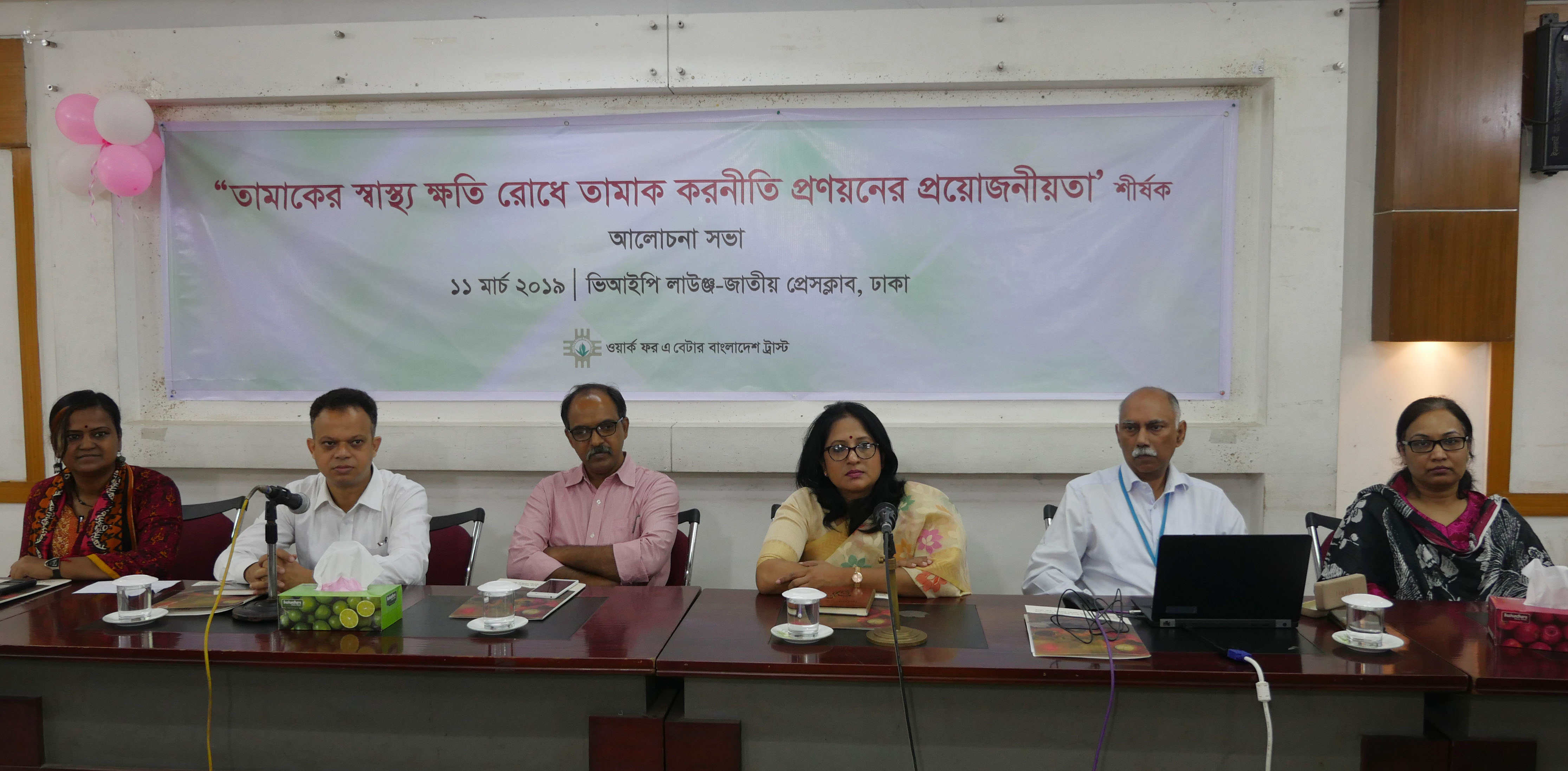 প্রকৃত মূল্য ও সুনির্দিষ্ট কর বৃদ্ধি তামাকের ব্যবহার কমাবে, সরকারের রাজস্ব বাড়াবে, দীর্ঘমেয়াদে স্বাস্থ্যখাতে ব্যয় কমবে এবং আগামী দিনে সুস্থ্য সবল জাতি পাওয়া যাবে। বাংলাদেশের বিদ্যমান কর ব্যবস্থায় তামাক কোম্পানিগুলো লাভবান হয়। কর বৃদ্ধির ক্ষেত্রে লক্ষ্য রাখা প্রয়োজন, যাতে তামাক কোম্পানির লাভ বেড়ে না যায়। তামাক ব্যবহার কমাতে মাননীয় প্রধানমন্ত্রীর নির্দেশনা অনুসারে জাতীয় তামাক করনীতি প্রণয়ন করা জরুরি। আজ ১১ মার্চ ২০১৯ ওয়ার্ক ফর এ বেটার বাংলাদেশ (ডাব্লিউবিবি) ট্রাস্ট এর উদ্যোগে জাতীয় প্রেসক্লাবের ভিআইপি লাউঞ্জে “তামাকের স্বাস্থ্য ক্ষতি রোধে তামাক ...