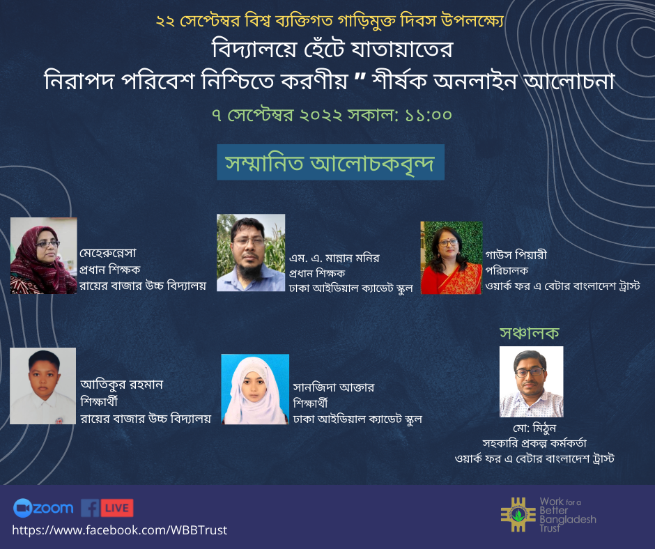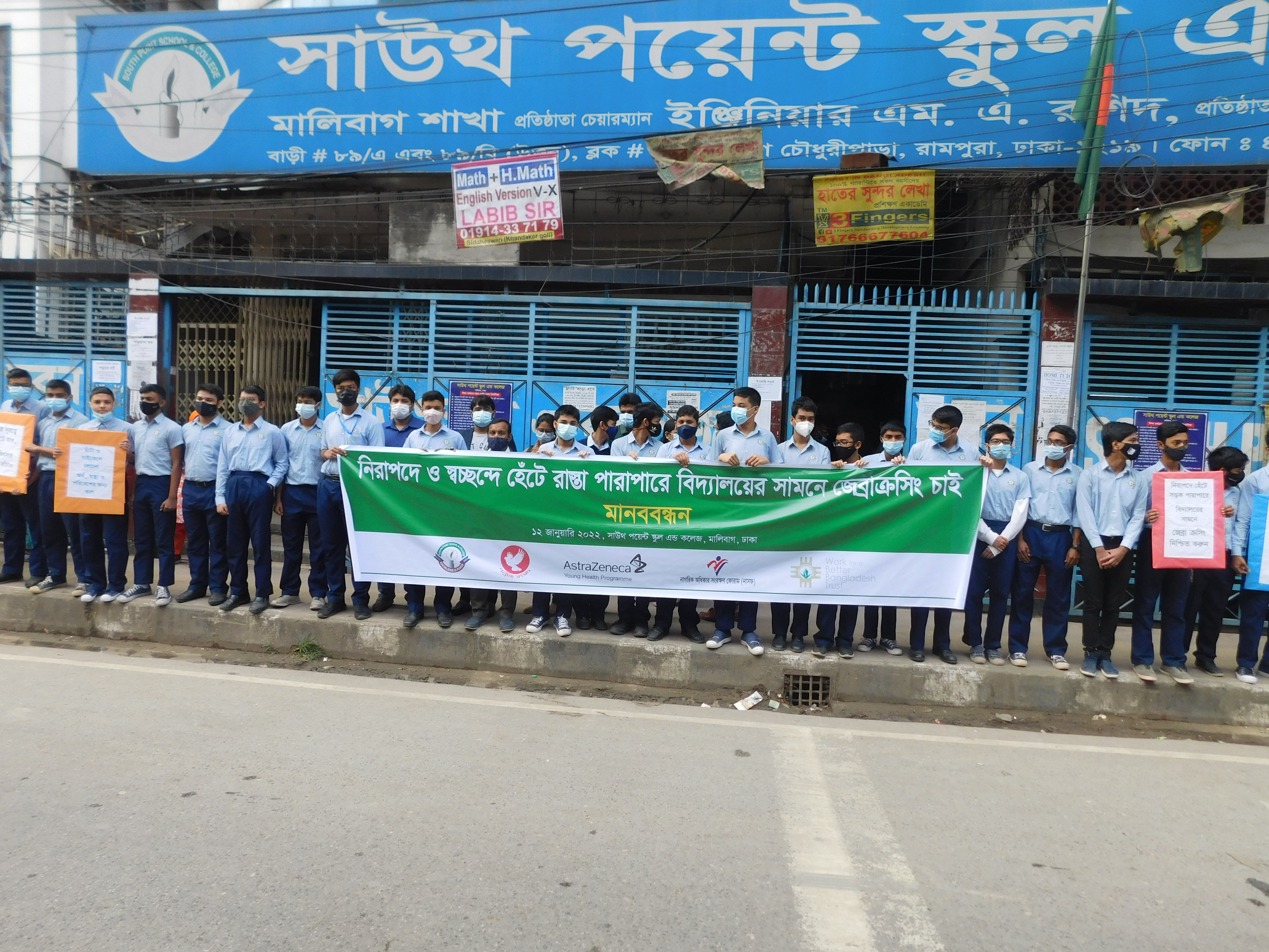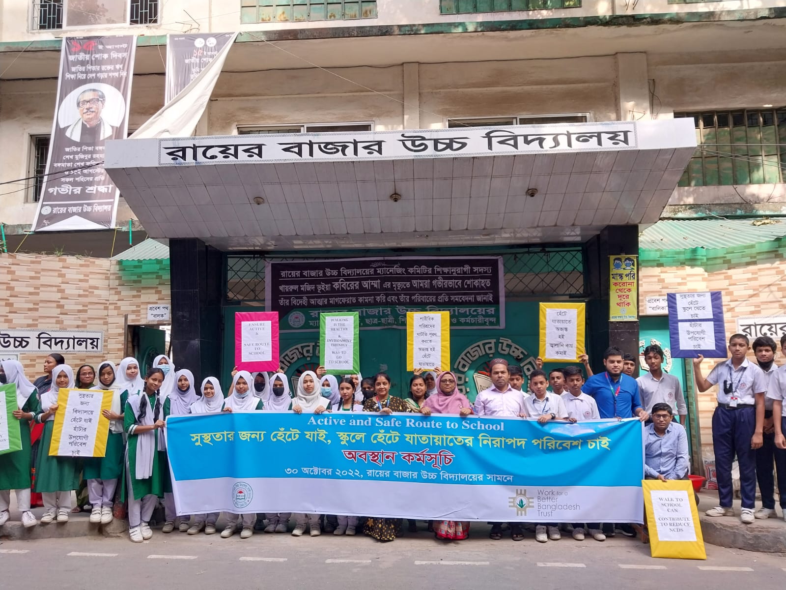 অক্টোবর ২০২২ সকাল ১০.০০ টায় ‘সুস্থতার জন্য হেঁটে যাই, স্কুলে হেঁটে যাতায়াতের নিরাপদ পরিবেশ চাই’- শীর্ষক স্লোগানে রায়ের বাজার হাই স্কুল কর্তৃক একটি অবস্থান কর্মসূচি এবং ঢাকা আইডিয়াল ক্যাডেট স্কুল কর্তৃক আয়োজিত একটি র্যালি থেকে শিক্ষার্থীরা এ দাবি জানায়।