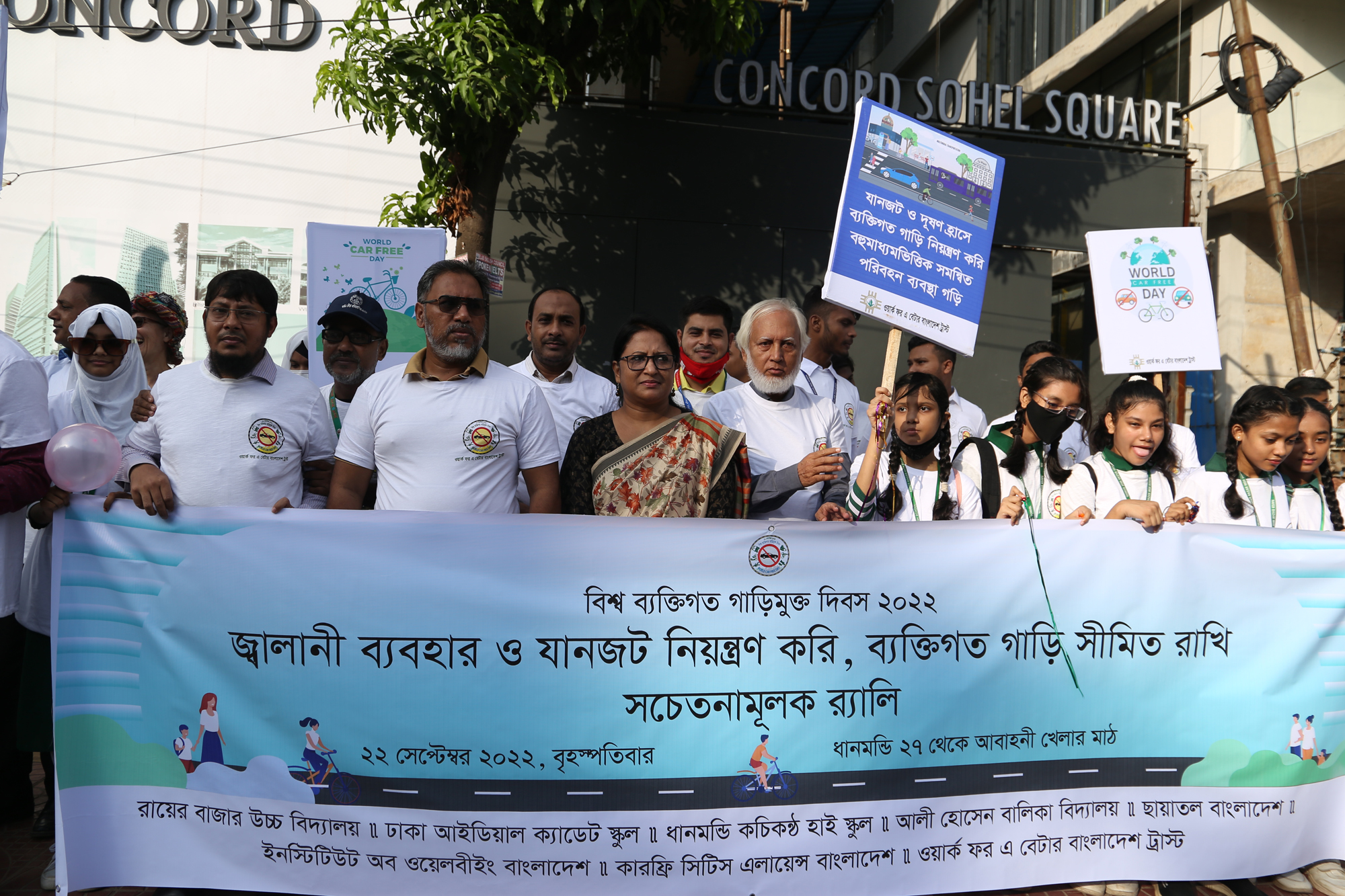 সেপ্টেম্বর ২০২২, বৃহস্পতিবার, সকাল ০৭.০০টায় রায়ের বাজার উচ্চ বিদ্যালয়, ঢাকা আইডিয়াল ক্যাডেট স্কুল, ধানমন্ডি কচিকন্ঠ হাই স্কুল, আলী হোসেন বালিকা বিদ্যালয়, ছায়াতল বাংলাদেশ, ইনস্টিটিউট অব ওয়েলবীইং বাংলাদেশ, কারফ্রি সিটিস এলায়েন্স বাংলাদেশ এবং ওয়ার্ক ফর এ বেটার বাংলাদেশ ট্রাস্ট এর সম্মিলিত উদ্যোগে বিশ্ব ব্যক্তিগত গাড়িমুক্ত দিবস ২০২২ পালন উপলক্ষে আয়োজিত “ জ্বালানী ব্যবহার ও যানজট নিয়ন্ত্রন করি, ব্যক্তিগত গাড়ি সীমিত রাখি” শীর্ষক সচেতনতামূলক র্যালীতে বক্তারা এ কথা বলেন।