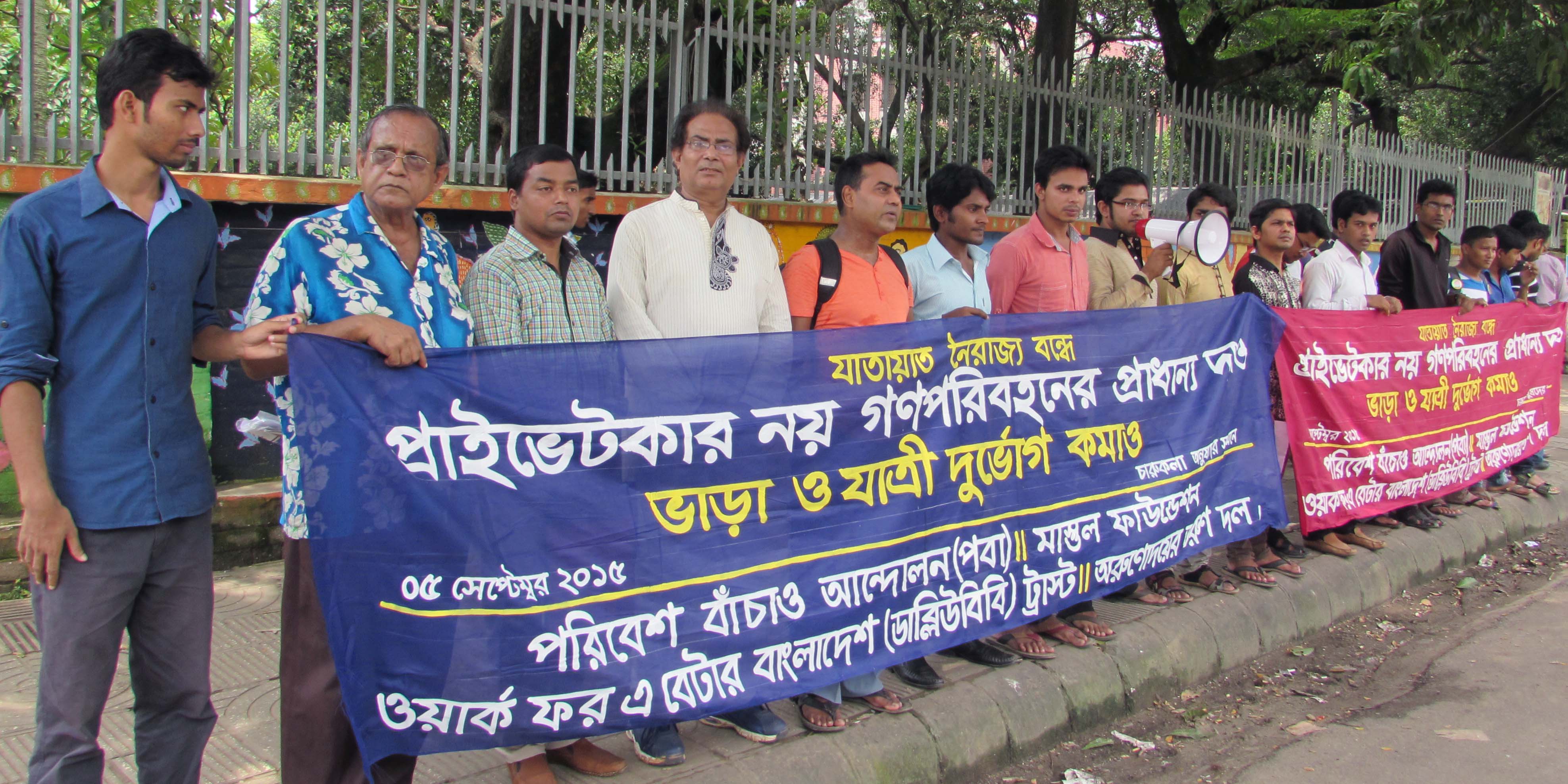 অতিরিক্ত ভাড়া নিয়ে বাস ও মিনিবাস শ্রমিকদের সাথে যাত্রীদের বাদানুবাদ এমনকি হাতাহাতি, মারামারির ঘটনাও ঘটছে এবং যাত্রীরা হয়রানির স্বীকার হচ্ছে। যাত্রী হয়রানি এবং গণপরিবহনে অতিরিক্ত ভাড়া আদায় বন্ধের দাবীতে আজ ২১ অক্টোবর ২০১৫, বুধবার, সকাল ১১টায় জাতীয় প্রেসক্লাবের সামনে পরিবেশ বাঁচাও আন্দোলন (পবা), ওয়ার্ক ফর এ বেটার বাংলাদেশ (ডাব্লিউবিবি) ট্রাস্ট, নাগরিক অধিকার সংরক্ষণ ফোরাম (নাসফ), মার্শাল আর্ট ফাউন্ডেশন, আইনের পাঠশালা, পরিবেশ উন্নয়ন সোসাইটি, পল্লীমা গ্রীণ এবং বিসিএইসআরডির যৌথ উদ্যোগে মানববন্ধনের আয়োজন করা হয়। ...