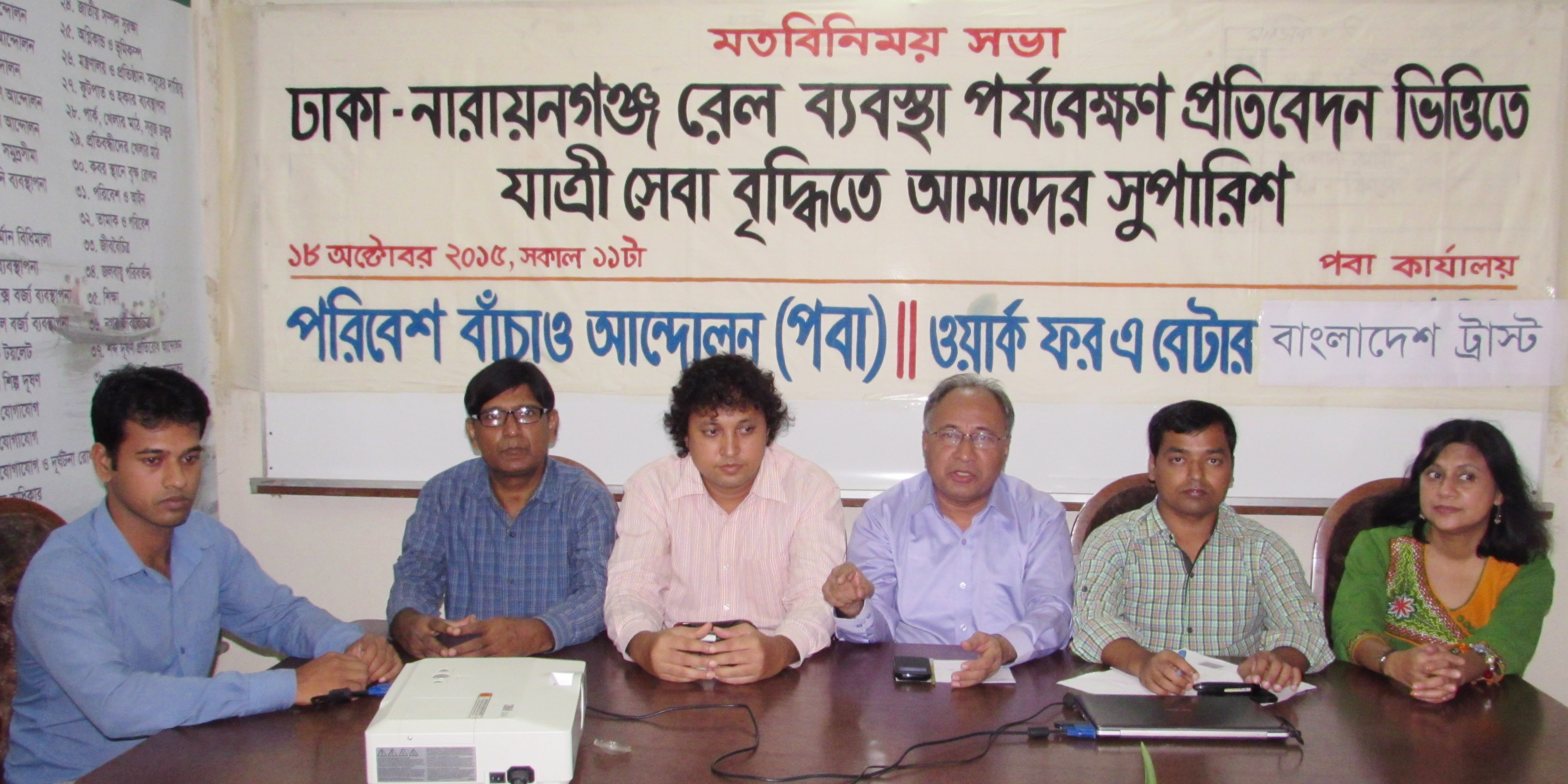 নারায়নগঞ্জ যাত্রী সেবা বৃদ্ধি এবং ডাবললাইন নির্মান করা হলে অধিকসংখ্যক কমিউটার ট্রেন চালুর মাধ্যমে ঢাকার নিকটবর্তী জেলাগুলোর ( ব্রাহ্মণবাড়ীয়া, নরসিংদি, ভৈরব, গাজীপুর, টাঙ্গাইল, ময়মনসিংহ, প্রভৃতি) সাথে সংযোগ স্থাপনসহ যাত্রী দুর্ভোগ লাঘব করা সম্ভব হবে। এতে করে রেল যেমন স্বনির্ভর হবে তেমনি ঢাকা শহরের উপর জনসংখ্যার চাপ কমবে এবং জেলা পর্যায়ের অর্থনৈতিক উন্নয়নে ভূমিকা রাখবে। আজ ১৮ অক্টোবর, ২০১৫, রোজ রবিবার সকাল ১১.০০ টায় পরিবেশ বাঁচাও আন্দোলন (পবা) এবং ওয়ার্ক ফর এ বেটার বাংলাদেশ ট্রাস্ট (ডাব্লিউবিবি) এর যৌথ উদ্যোগে আয়োজিত “ঢাকা-নারায়নগঞ্জ ...