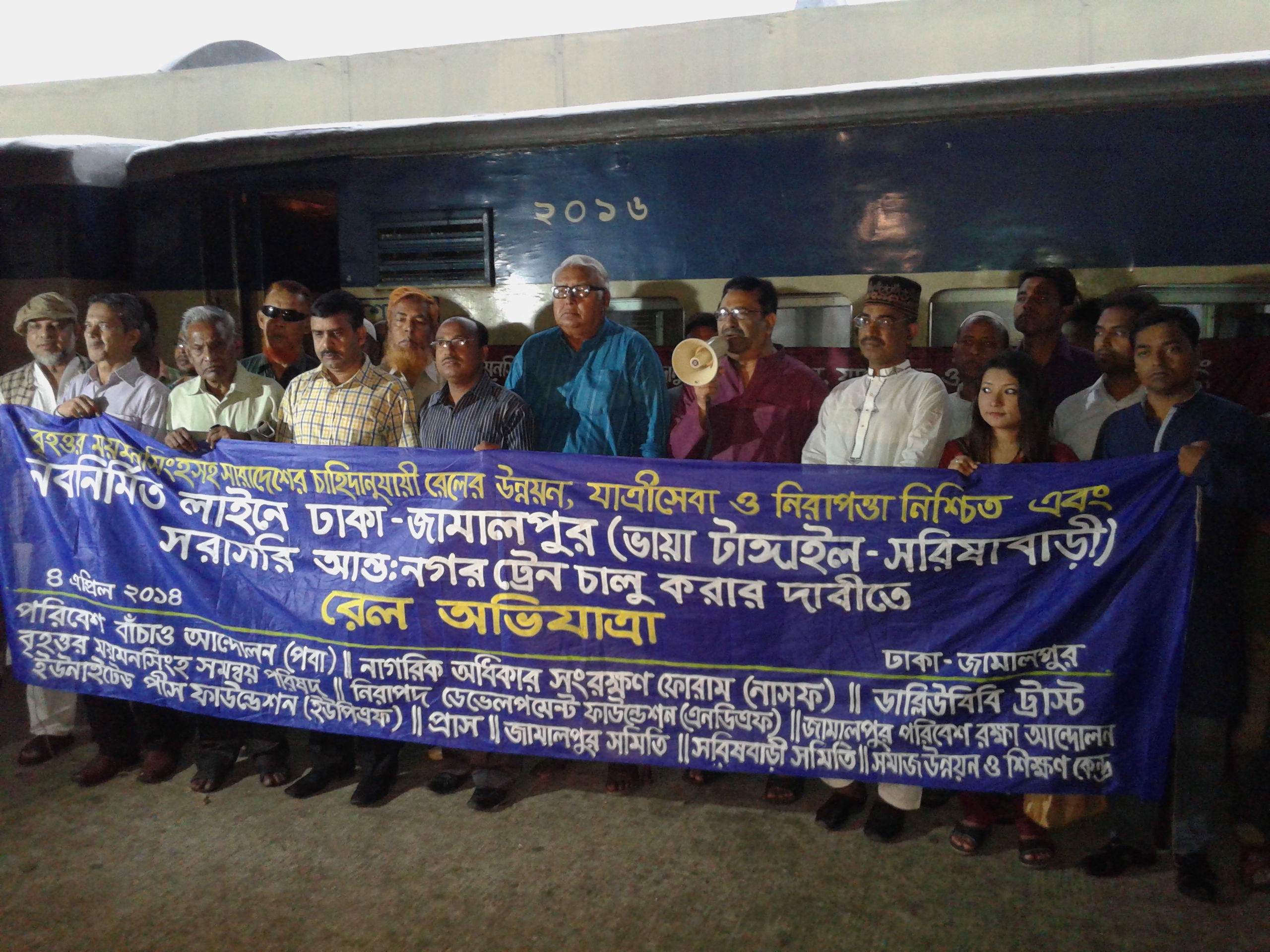 ৪ এপ্রিল ২০১৪ তারিখে পরিবেশ বাঁচাও আন্দোলন (পবা), ডাব্লিউবিবি ট্রাস্ট, নাগরিক অধিকার সংরক্ষণ ফোরাম (নাসফ), বৃহত্তর ময়মনসিংহ সমন্বয় পরিষদ, নিরাপদ ডেভেলপমেন্ট ফাউন্ডেশন (এনডিএফ), ইউনাইটেড পীস ফাউন্ডেশন (ইউপিএফ), বৃহত্তর ময়মনসিংহ সমন্বয় পরিষদ, জামালপুর পরিবেশ রক্ষা আন্দোলন, জামালপুর সমিতি, সরিষাবাড়ী সমিতি যৌথভাবে বৃহত্তর ময়মনসিংহসহ সারাদেশের চাহিদানুযায়ী রেলের উন্নয়ন, যাত্রীসেবা, নিরাপত্তা নিশ্চিত করার দাবীতে রেল অভিযাত্রার আয়োজন করে। ...