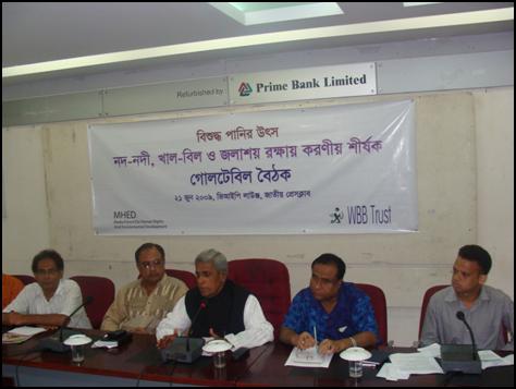 ২১ জুন ২০০৯ তারিখে জাতীয় প্রেসক্লাবে ভিআইপি লাউঞ্জে ওয়ার্ক ফর এ বেটার বাংলাদেশ (ডাব্লিউবিবি) ট্রাস্ট এর উদ্যোগে এবং মানবাধিকার ও পরিবেশ উন্নয়নে মিডিয়া সেন্টার এর সহযোগিতায় “বিশুদ্ধ পানির উৎস নদ-নদী, খাল-বিল ও জলাশয় রক্ষায় করণীয়” শীর্ষক গোলটেবিল বৈঠক এর আয়োজন করে। সঞ্চালনার দায়িত্ব পালন করেন ডাব্লিউবিবি ট্রাস্ট এর পরিচালক সৈয়দ মাহবুবুল আলম এবং মূল প্রবন্ধ উপস্থাপন করেন এমইডি এর নির্বাহী পরিচালক রফিকুল ইসলাম। এছাড়া ওয়াটার রিসোর্স সংসদীয় কমিটির সভাপতি এমপি আব্দুর রাজ্জাক, যোগাযোগ মন্ত্রণালয়ের সংসদীয় কমিটির সদস্য এমপি নজরুল ইসলাম ...