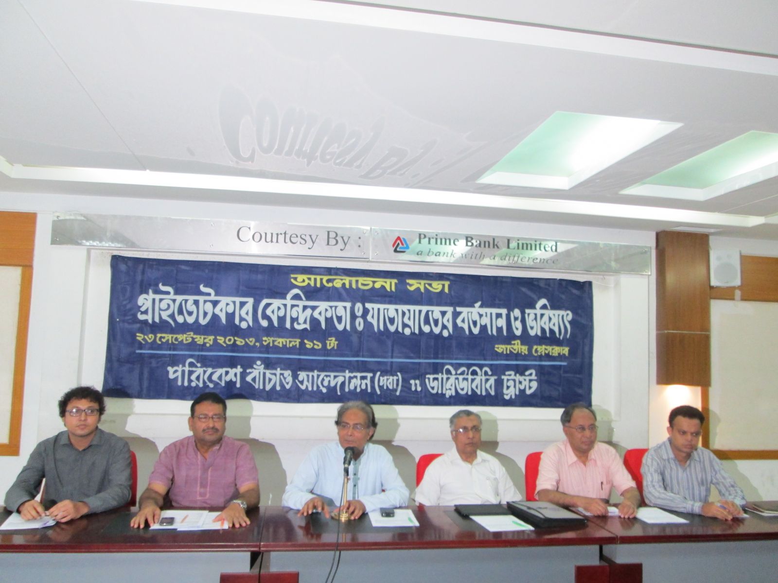 Poribesh Bachao Andolon (POBA) and Work for a Better Bangladesh Trust organized a discussion meeting on "Car centric development: Present and Future Transportation System in Dhaka" at 11 A.M. at VIP lounge, national press club yesterday on the event of World Car Free Day 2013 on 23 September. Abu Naser Khan, Chairman, POBA Advocate preside the program. Dr. Sarwar Jahan, Professor, Dept. of URP, BUET, Ex ADG, DoE and Mr. Hafijur Rahman Moyna, President, NASAF, Syed Mahbubul Alam, Director, WBBT WBBT were present as panelist and Maruf Rahman, National Advocacy Officer, WBBT presented a presentation on that issue.