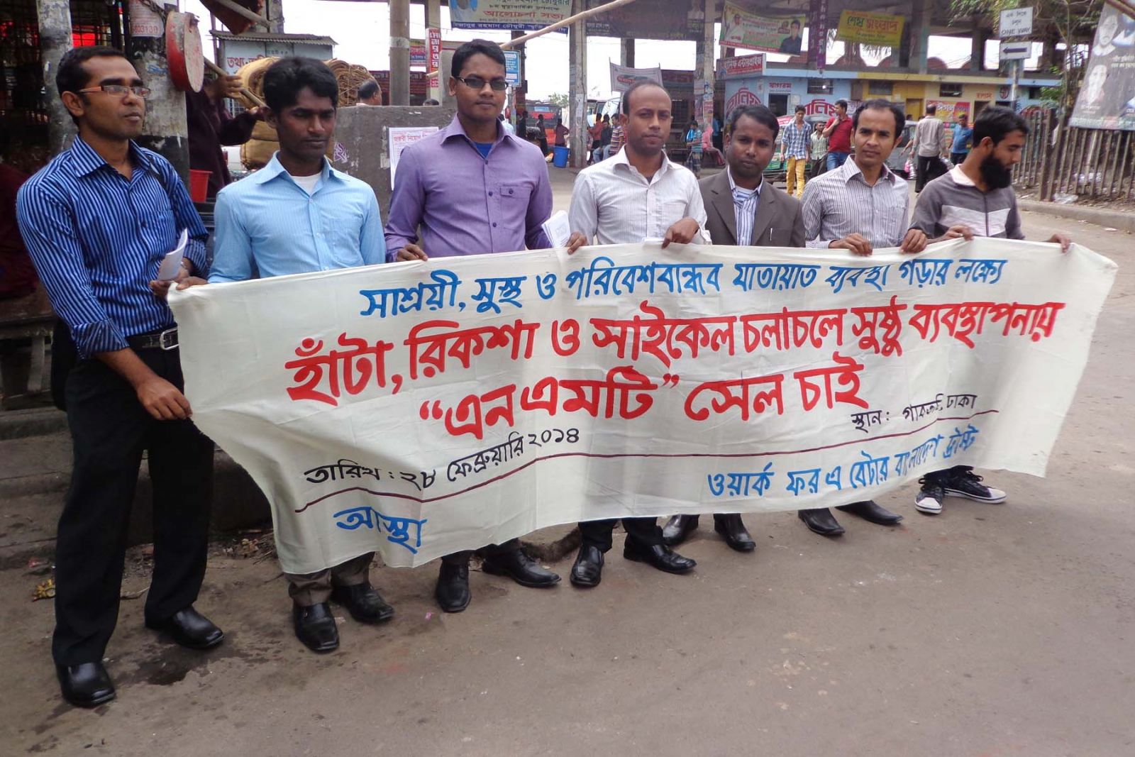 On 28 February 2014, Work for a Better Bangladesh Trust and Astha organized a campaign on demanding Walking, rickshaw and bicycle lanes in Gabtholi.