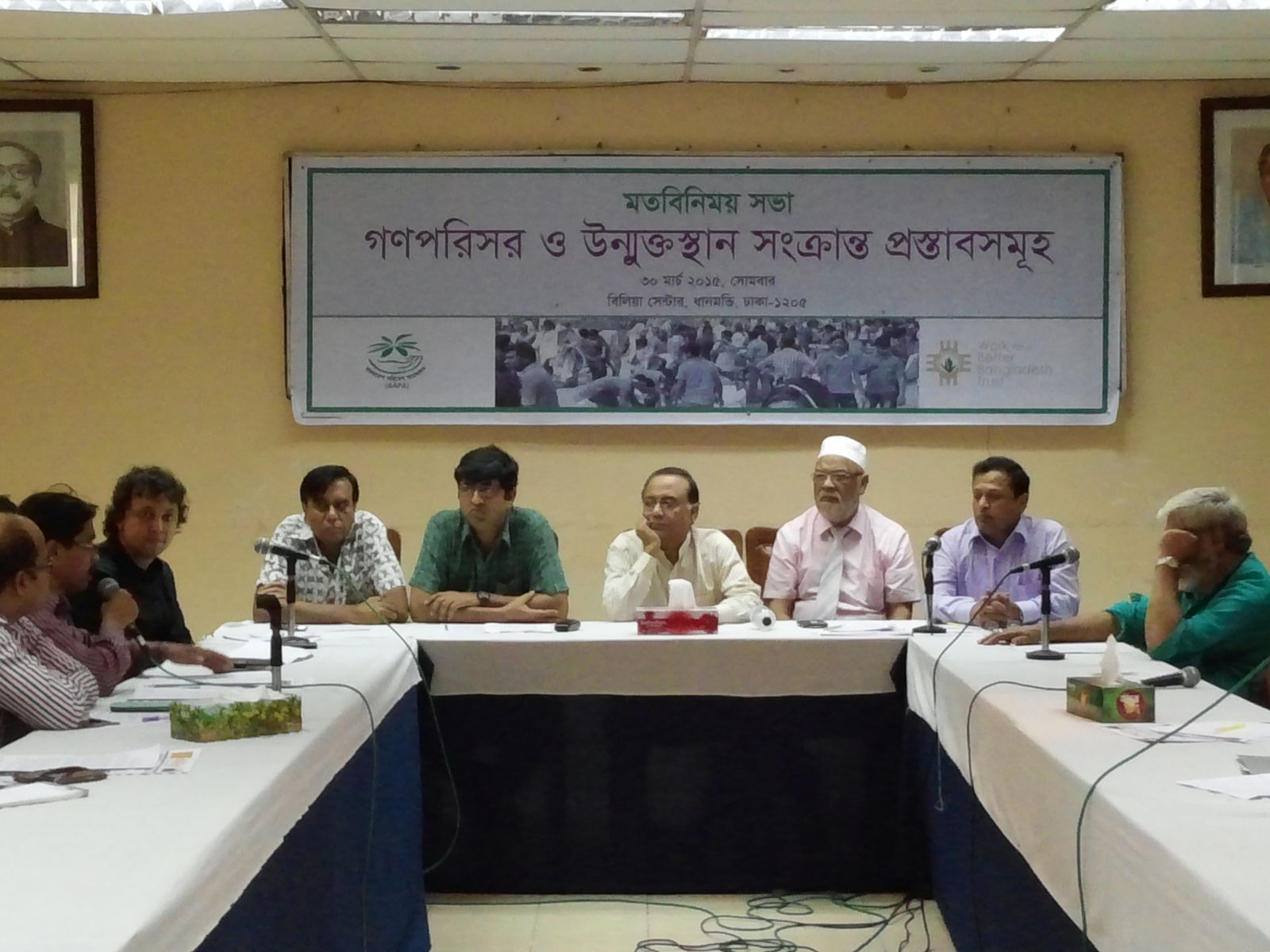 Bangladesh Poribesh Andolon (BAPA) and Work for a Better Bangladesh Trust  jointly organize discussion meeting on " Proposal for Public place and Open Space" on 30th March 2015 at 11am at the BILIA Centre, Dhanmondi. Bangladesh Poribesh Andolon (BAPA) vice-president architect Mobassher Hossain's has presided, Work for a Better Bangladesh Trust Project Officer Ziaur Rahman has presented keynote paper and National Advocay officer Maruf Hossain has modareted the meeting.