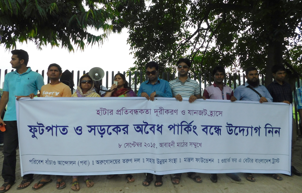 There is a loss of 23,000 crore taka every year because of the traffic jam in Dhaka. Only 5% trips are conducted by cars in Dhaka city. But they are being prioritized by ignoring those who walks, use cycle or public transit. It is mentioned in the law to prioritize pedestrian first. But we cannot see that in reality. There is absence of footpaths in maximum roads. And in some places there are footpaths but broken and uneven. In some roads we can see wide footpaths but those have been occupied by private cars. Using the ramp for the wheel chair users private car owners park their car in the footpaths. In Dhanmondi Sat Masjid Road we can see this type of illegal parking in front of universities, hospitals, offices and markets. This is causing traffic jam as well as creating obstacles while walking. On 8th September 2015 11 am, Poribesh Bachao Andolon (POBA), Orunodoyer Torun Dol, Mastul Foundation, Shohay Unnoyon Shongstha and Work for a Better Bangladesh Trust jointly organized a program in front of Abahoni Playground on the demand to stop illegal parking in footpaths and roads.