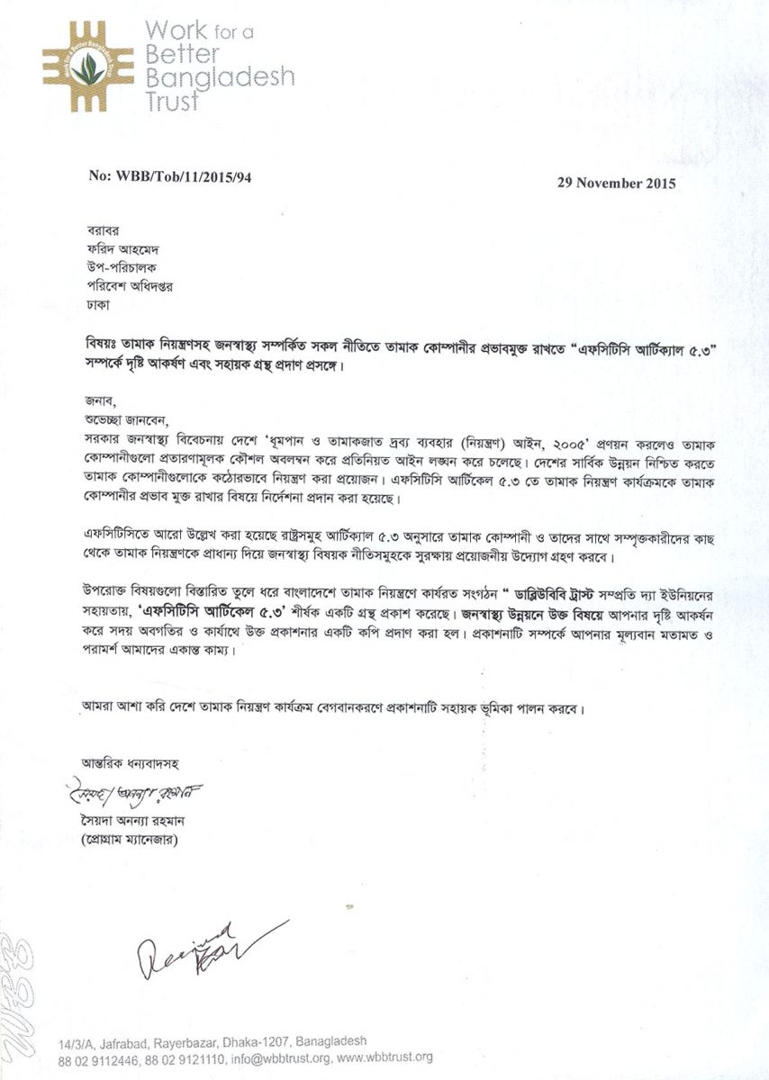 Mr. Farid Ahmed, Deputy Director of Department of Environment has been sensitized about tobacco companies interaction with govt. agency through plantation program under the coverage of ‘corporate social responsibility’ in a meeting held on 29th November 2015 at Department of Environment.