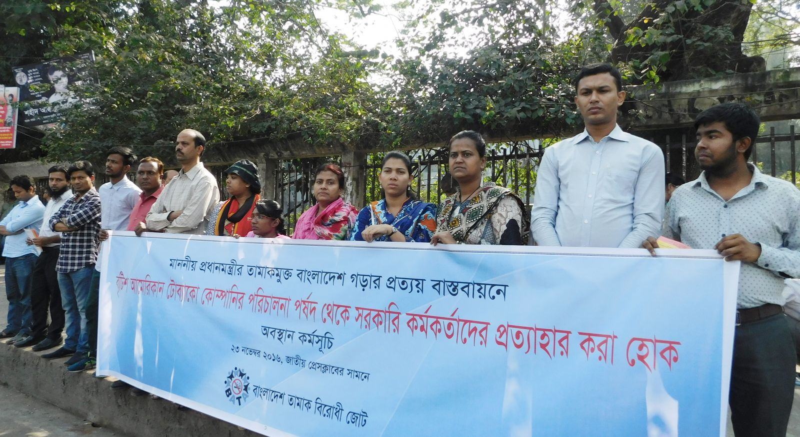 In a sit-in program organized by Bangladesh Anti-Tobacco Alliance (BATA) on 23 November 2016 in front of National press Club, anti-tobacco activists opined this demand. ‘On one hand government's efforts on tobacco control, on the other hand government’s shares in tobacco company and attempt of receiving profits from discouraged product and representation of govt. officials in BATB’s board of directors creates questions about tobacco control efforts to the people’, speakers said. Beforehand it showed that, tricky tobacco companies have invaded tobacco control programs by influencing various ways. To implement Prime Minister’s conviction of tobacco free Bangladesh by 2040, it is necessary to withdraw government officials from BAT’s board of directors.