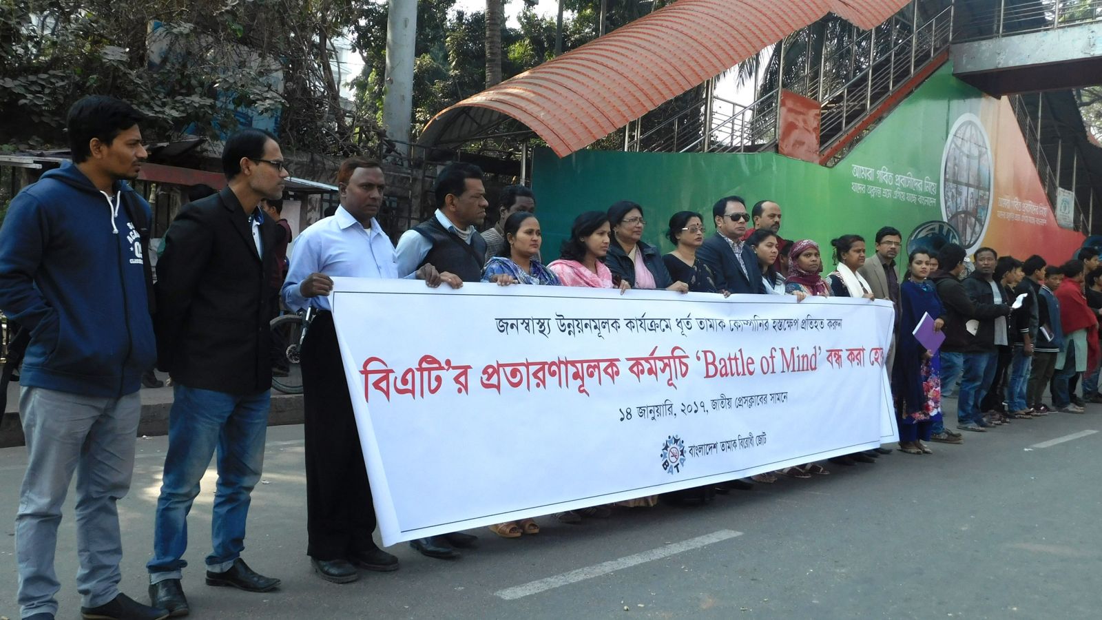 Every year about 6 million people died early death worldwide and 70% of that occurs in developing countries like Bangladesh. The whole world is currently active to control this unwanted premature death. Considering the public health, Bangladesh government has taken various initiative in tobacco control i.e. formulation of tobacco control act and rules. But, tobacco companies are violating the law in many ways as well as organizing program titled “Battle of mind” as their market promotional strategy. This type of activities is one kind strategy to influence policy makers along with market promotion. Addressing the issue, with the support of Work for a Better Bangladesh trust, Bangladesh Anti-Tobacco Alliance (BATA) organized a sit-in-place on the demand of “Stopping BAT’s fraudulent program ‘Battle of Mind’ for public health development” on 14 January 2017 in front of National Press Club.