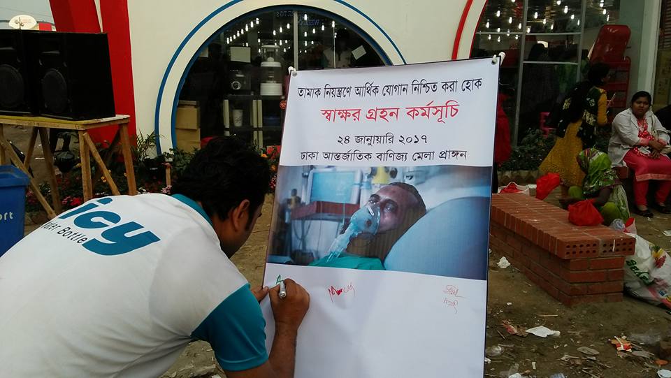 Giving priority on tobacco control and disease prevention it is necessary to ensure sustainable funding in this sector. Government has taken initiative to finalize the ‘Surcharge management policy’ for proper management of surcharge money imposed on tobacco products. In this policy, need to emphasize on the control of non-communicable diseases as well as tobacco. Emphasizing necessity of sustainable funding for tobacco control and NCD prevention, Work for a better Bangladesh (WBB) Trust has organized a signature campaign titled ‘Ensure sustainable funding for tobacco control by at Dhaka International Trade  Fair on 24 January 2017.