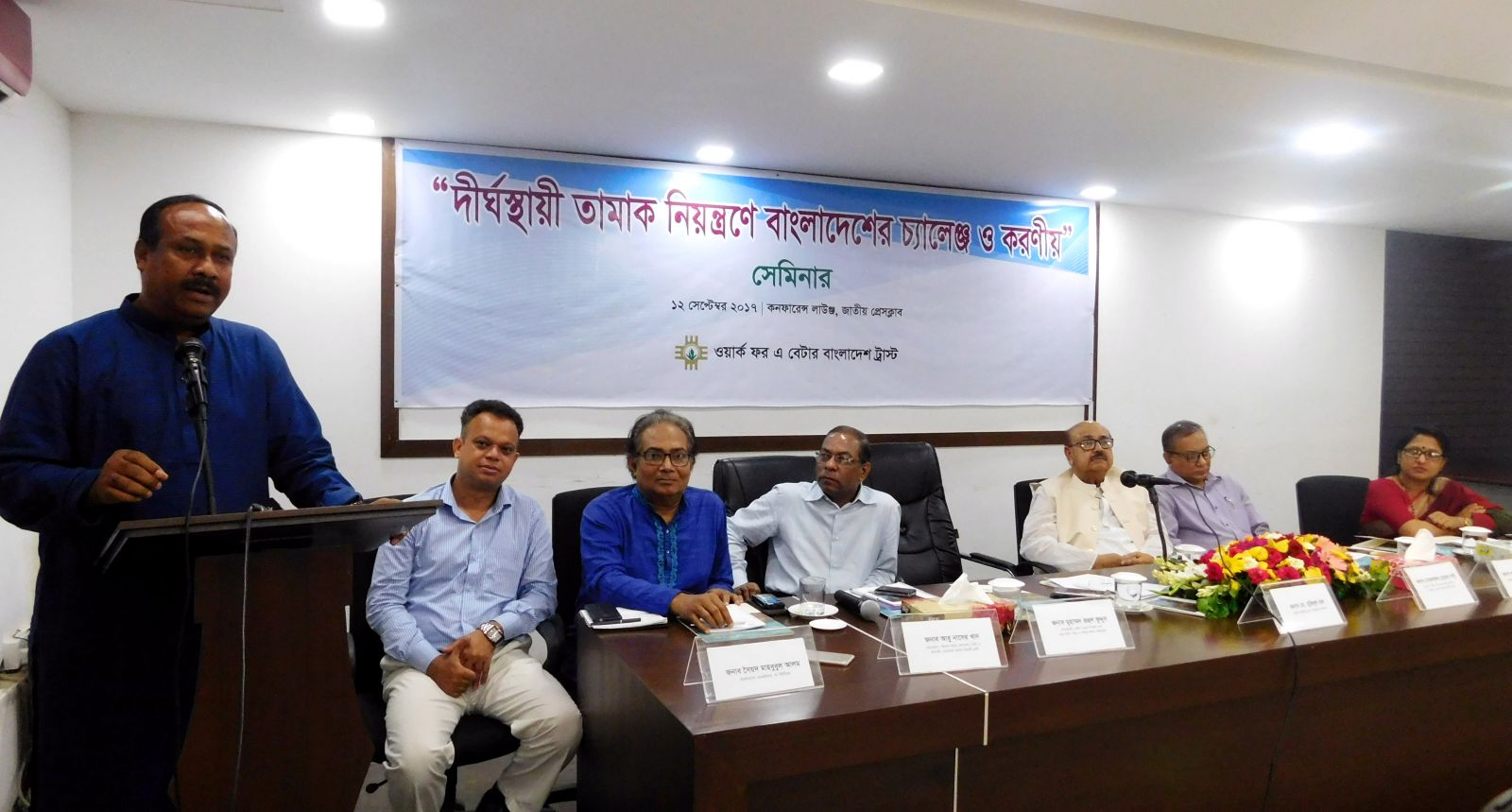 In Bangladesh, about 43.3% adults use tobacco. Major efforts should be taken to keep this huge population free from the terrible effects of tobacco. In a seminar titled on “Challenges of sustainable tobacco control in Bangladesh and necessary actions ” organized by Work for a Better Bangladesh (WBB) Trust, speakers expressed this.