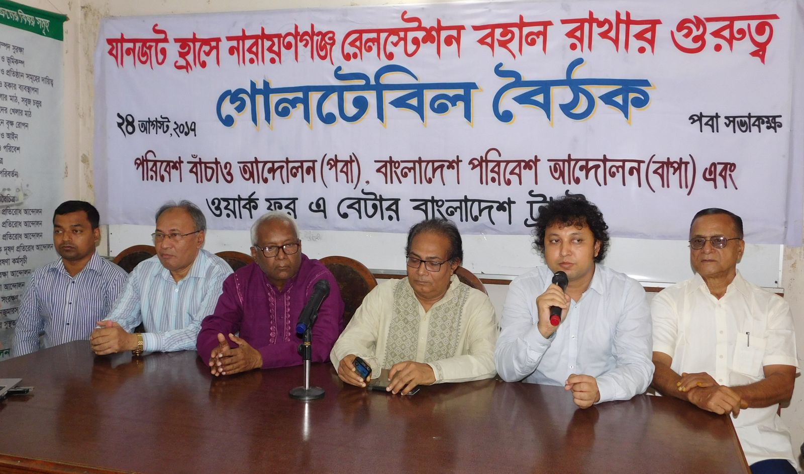 Everyday around 4500 people including service holder, business man and students, travel using Dhaka-Narayanganj rail route. According to information, administration is thinking to shut down Narayanganj Rail Station to build multi-storied building and wants to create road by removing Chashara to Narayanganj rail line. Dhaka- Narayanganj rail route plays an important role in reducing traffic congestion and population load in Dhaka. So it is important to ensure Dhaka-Narayanganj Double Rail line and not to shut down the Narayanganj Rail station. On 24th August, 2017, Save the Environment Movement (POBA), Bangladesh Poribesh Andolon (BAPA) and Work for a Better Bangladesh Trust jointly organized a round table meeting on ‘Importance of Narayanganj Rail station to reduce Traffic Congestion’ in POBA office and speakers mentioned the above view there.