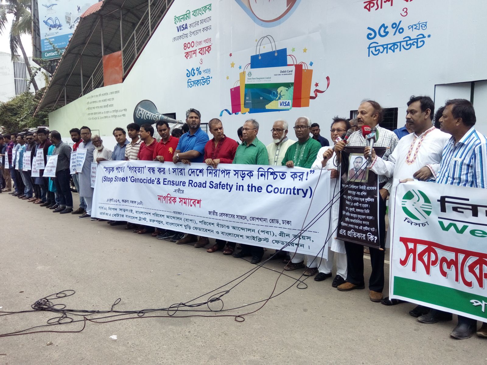 LAB’ 02, Nirapad Sarak Chai, Bangladesh Poribesh Andolon (BAPA), Poribesh Bachao Andolon (POBA), Green Voice, Work for a Better Bangladesh Trust, Toru Pallab, Bangladesh Kite Federation and Bangladesh Cyclist Federation jointly organized a citizen rally on 14th July 2017 in front of National Press Club on demand of ensuring road safety throughout the country.