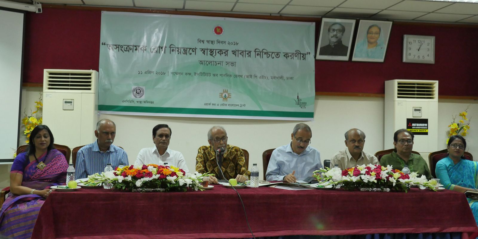 Currently, 67% of total deaths in Bangladesh happen due to non-communicable diseases. In order to provide safe food for controlling non-communicable diseases, necessary steps should be taken by various government agencies to ensure effective implementation of existing laws and policies. Speakers expressed this in a discussion meeting at Institute of Public Health on 11 April 2018. The meeting titled “Ensuring healthy food for NCD control” jointly organized by NCDC-DGHS, Work for a Better Bangladesh Trust and CNRS.
