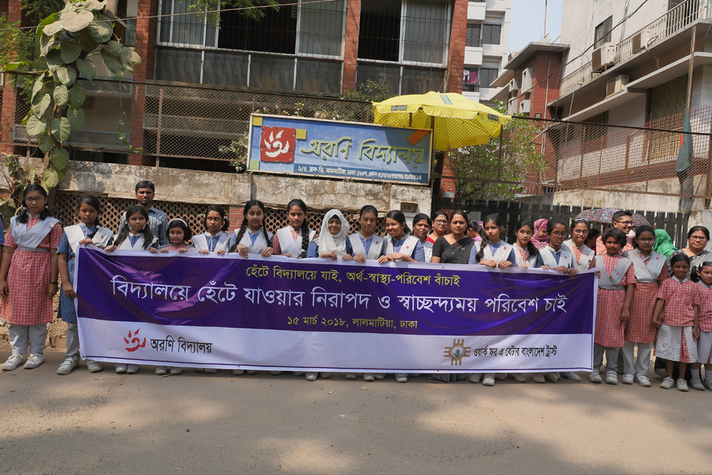 Now-a-days we have less opportunity for physical activity so; children are suffering from obesity, type 2 diabetes, insomnia and other diseases. Lack of enough open space is one of the major reasons behind this. Children will get opportunity of physical activity by walking to school. Traffic congestion in Dhaka becomes the worst during school time. Congestion problem can be reduced by promoting walking. Because of poor walking condition people is discouraged to walk. Many children walk to school in Dhaka. It is important to develop the walking environment. On 15th March 2018 Aroni School in Lalmatia and Work for a Better Bangladesh Trust jointly organized an orientation program on Active and Safe Route to School. After the orientation a human chain was organized on demand of safe walking environment.
