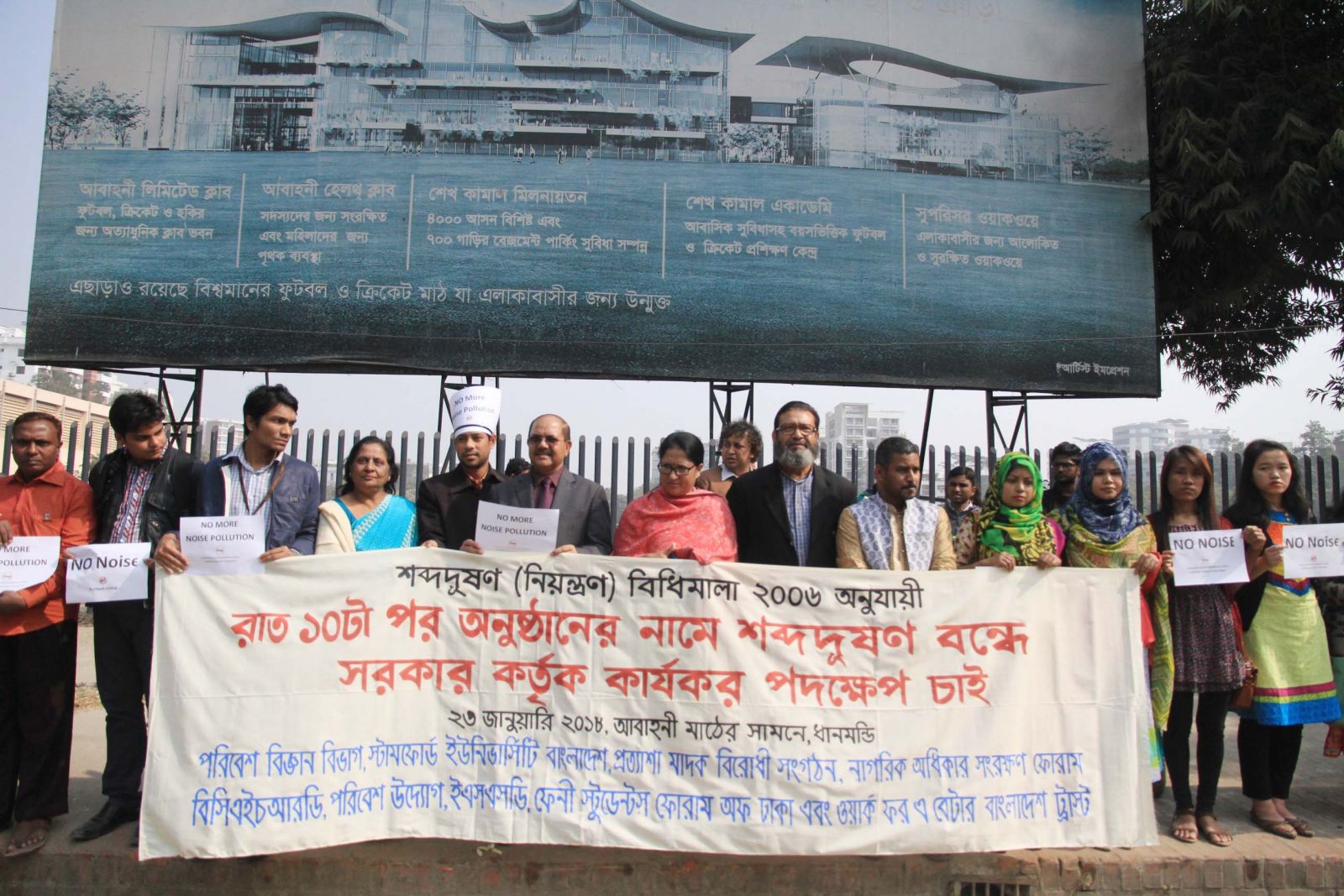On 23rd January 2018, Department of Environmental Science of Stamford University, Protyasha Anti-Drug Club, Nagorik Adhikar Shongrokkhon Forum, BCHRD, Poribesh Udyog, ESSD, Feni Students Forum of Dhaka and Work for a Better Bangladesh Trust jointly organized a human chain on demand of Stopping Noise Pollution in the name of Celebration after 10 PM. And speakers expressed as above in the event.