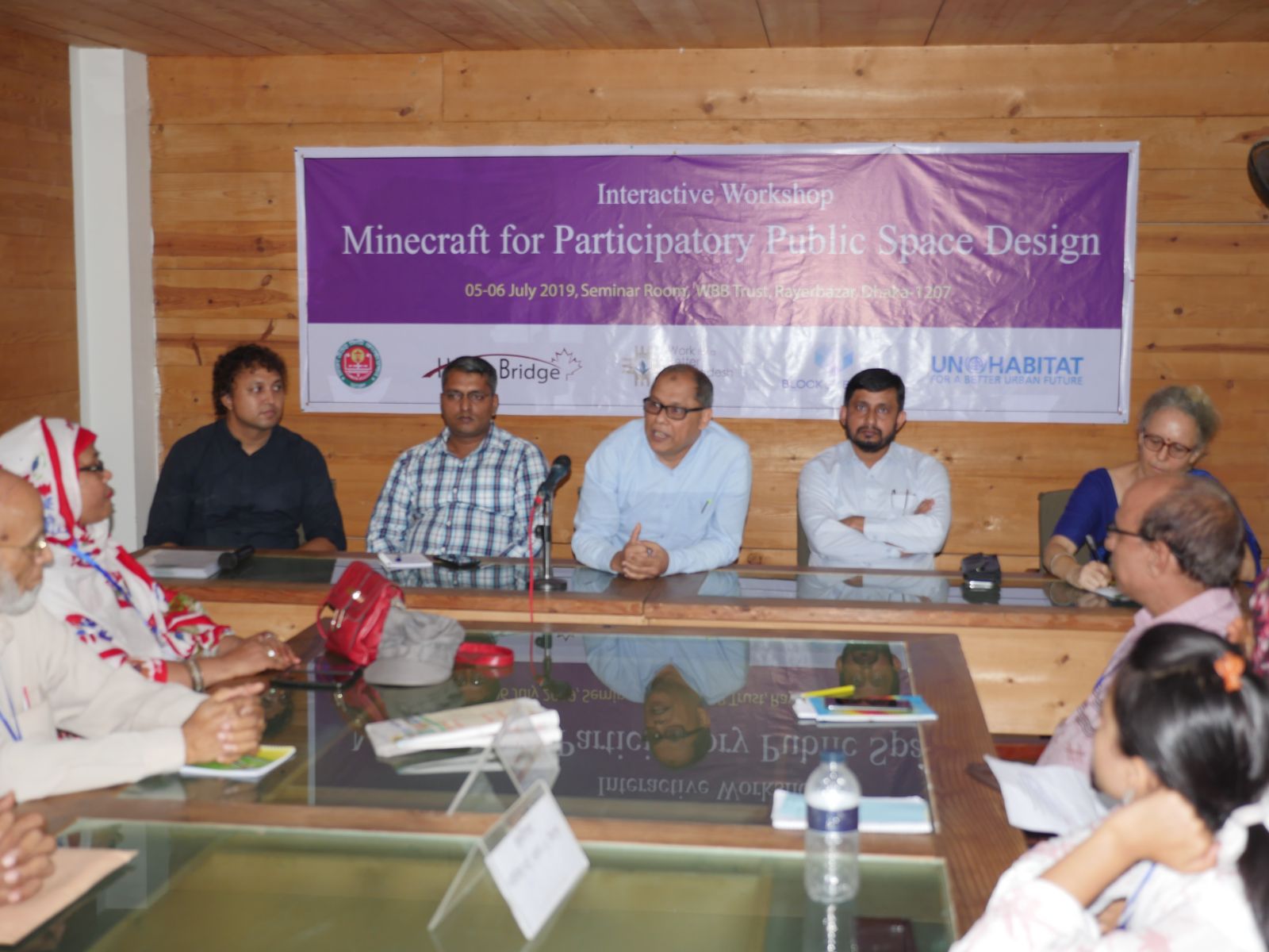 Parks and playgrounds play a very important role in cities. But Dhaka city lacks this important component in most communities. And the areas having parks and playgrounds are not fully utilized. A playground becomes accessible for all, when it reflects requirements of everyone. Dhaka North City Corporation (DNCC), HealthBridge-Canada, Work for a Better Bangladesh Trust, Block by Block and UN-Habitat have jointly taken initiative to make six parks and playgrounds of Mirpur area (ward no 2, 4, 5, 7 and 9) accessible for all. Community people have created designs for each site by using Minecraft game. Participatory approach is very important while improving parks and playgrounds to ensure proper development, usage and maintenance of those. On 6th July 2019 speakers of the closing ceremony of interactive workshop on Minecraft for Participatory Public Space Design expressed such.