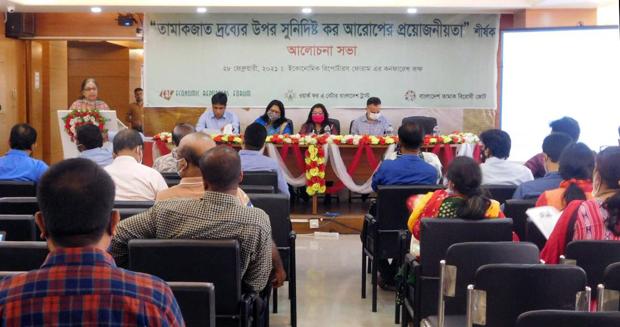 Economic Reporters Forum, Bangladesh Anti-Tobacco Alliance and Work for a Better Bangladesh Trust jointly organized a discussion on Necessary Imposition of Specific Tax on Tobacco Products on February 28, 2021. Adv. Syed Mahbubul Alam (TA, The Union), Gauss Pierre (Director, WBB Trust), Anti-tobacco researcher Shushanta Sinha (Special Correspondent, Jamuna TV) were attended at the meeting chaired by Sharmin Rinvi (President, Economic Reporters Forum).