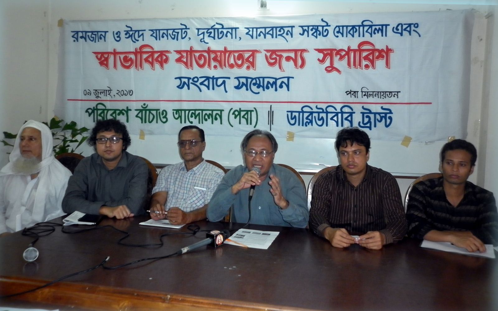 During Ramadan it is needed to take some steps for minimizing the traffic problems on road; such as: arranging educational institutes’ buses for general people travel; rescheduling the train time considering demand; splitting up the official closing time; preventing car parking on road and footpath; arranging safe trip for pedestrians. Adequate numbers of well conditioned buses, trains and water vehicles should be arranged short and long route travel. In this regard, law enforcement organizations and related institutions can take actions along with a declaration by government. A press conference entitled “Recommendations for resisting accidents, congestions and inadequate vehicles problems and ensuring smooth traveling during Ramadan and Eid” has been held on 09 July 2013 at 11 a.m. where speakers of POBA (Poribesh Bachao Andolon) and WBB Trust (Work for a Better Bangladesh Trust) have expressed their opinions.