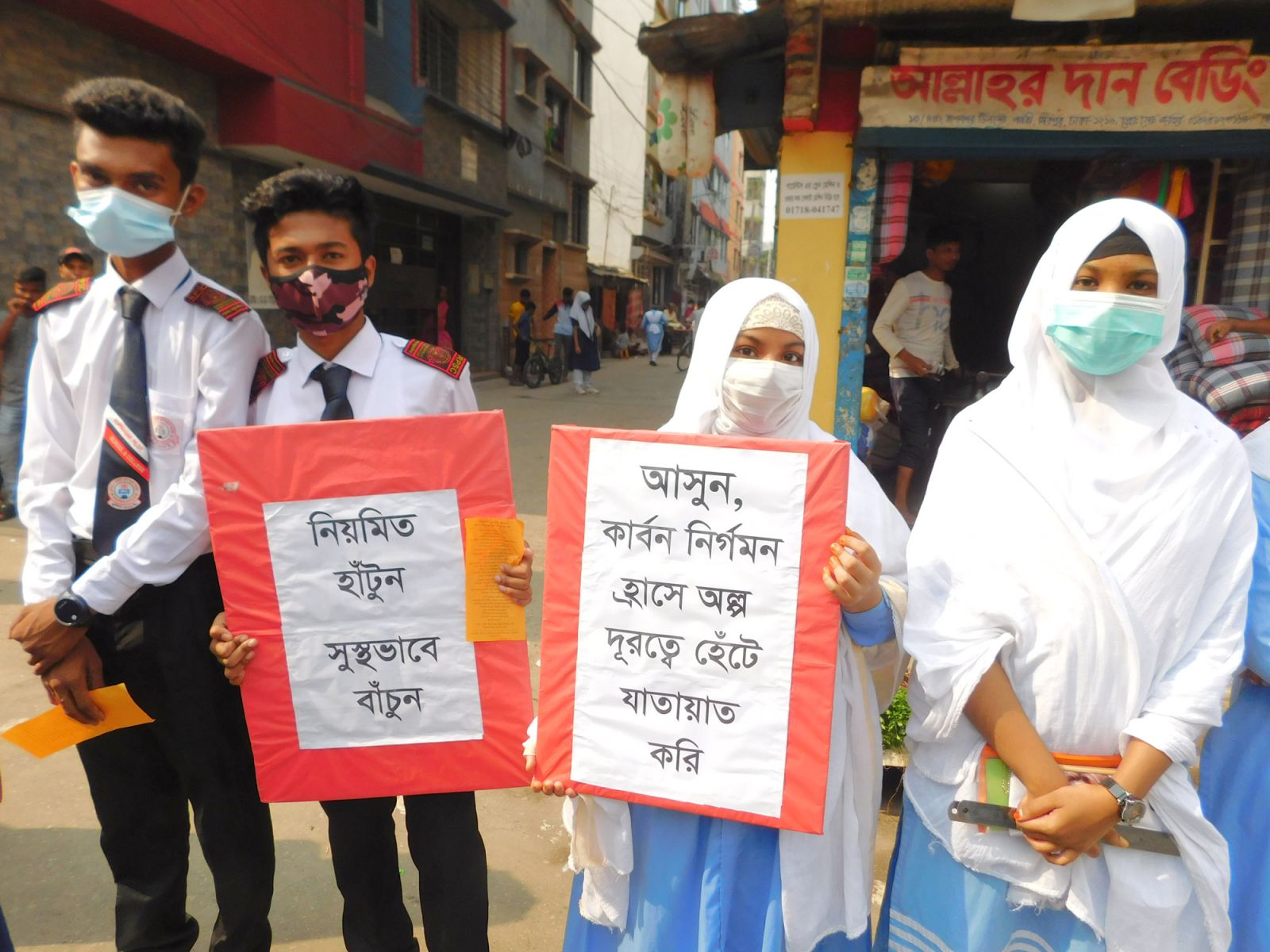 Extreme air pollution kills about 175,000 people in Bangladesh every year. Not only that, but air pollution also increases the risk of non-communicable diseases such as lung cancer and otherrespiratory diseases. Motorized vehicles emit 25% of the world's carbon, which is also accelerating climate change. Walking and cycling will reduce air and noise pollution, fuel consumption as well as traffic congestion and road accidents. At the same time, it is possible to meet the need for physical activity by walking, so the risk of non-communicable diseases will also be reduced. According to the Sustainable Urban Transportation Index of Dhaka city, school trips account for 17.7% of the total trips in the city. Significant changes in health and the environment are possible if this significant number of trips are conducted on foot and by bicycle. Speakers opined such in a human chain titled " Ensure Active and Safe Route to School to Reduce Non-communicable Diseases" in front of Rupnagar Pilot School and College jointly organized by Rupnagar Pilot School and College, Dhaka Ideal Cadet School, AstraZeneca, and Work for a Better Bangladesh Trust on 11 November 2021 at 11.00 am.