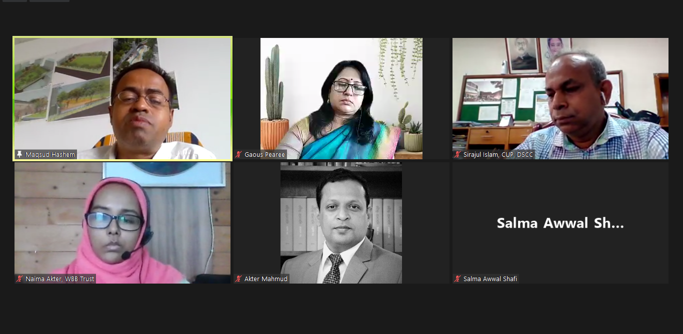 The program was moderated by Naima Akter, Project Manager, Work for a Better Bangladesh Trust. speakers of the program were Secretary of Center for Urban Studies, Salma A. Safi; Professor of Urban and Regional Planning Department of Jahangirnagar University Dr. Akter Mahmud; Chief Urban Planner of Dhaka South City Corporation Md. Sirajul Islam, Chief Urban Planner of Dhaka North City Corporation Maksud Hashem, and Gaous Pearee, Director, WBB Trust.
