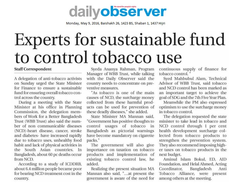 A delegation of anti-tobacco activists on Sunday urged the State Minister for Finance to ensure a sustainable fund for ensuring overall tobacco control across the country. During a meeting with the State Minister at his office in Planning Commission, the delegation members of Work for a Better Bangladesh Trust (WBB Trust) also said the number of non communicable diseases (NCD)-heart disease, cancer, stroke and diabetes- have increased rapidly due to tobacco uses, unhealthy food habit and lack of physical activities in the South Asian countries. In Bangladesh, about 60 pc deaths occur from NCD.