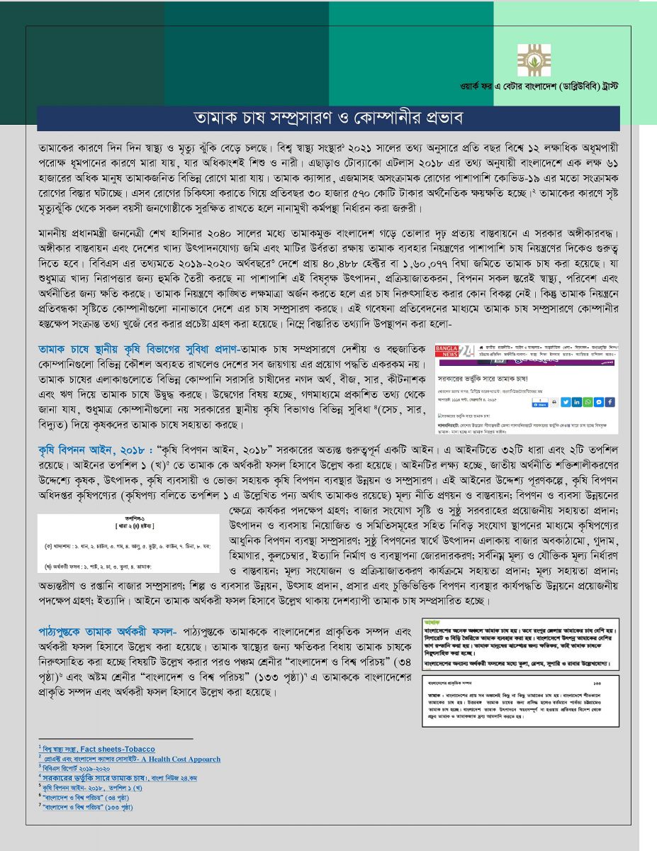 The WBB Trust has sent a letter of protest to the editor and publisher in a letter to the Bhorer Kagaz newspaper entitled "Public Smoking Rises Due to Lack of Smoke Zone". The health and death risks due to smoking are increasing day by day. According to the World Health Organization in 2021, more than 12 million smokers die each year from secondhand smoke, most of them children and women. In addition, according to the Tobacco Atlas 2016 data, more than one lakh 61 thousand people died in Bangladesh from various tobacco related diseases. Tobacco is spreading non-communicable diseases including cancer and asthma as well as communicable diseases like Kovid-19. In order to treat these diseases, an economic loss of Tk 30,560 crore is being incurred every year.